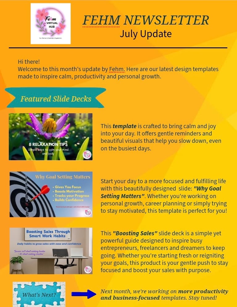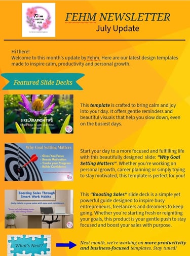 The FEHM Newsletter - July Update is a creative monthly bulletin designed and crafted in Adobe Express by FEHM Virtual Hub. This edition highlights Fehm's latest Canva slide templates - 8 Relaxation Tips, Why Goal Setting Matters and Boosting Sales Through Smart Work Habits - all created to inspire calm, productivity and growth.